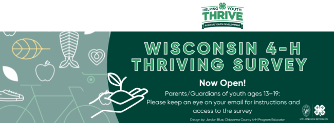 Every fall, Wisconsin 4-H encourages members (ages 13-18) to complete a survey about their 4-H experience. The survey was developed by National 4-H Leaders (https://helping-youth-thrive.extension.org/) and will help Wisconsin 4-H to learn about the quality of our programs. The information will help to show how 4-H helps young people to learn new things, develop leadership skills, manage goals, set high personal standards, create positive academic attitudes, and other skills that lead to long-term success in life.