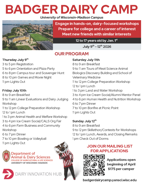 Badger Dairy Camp is a great oppertuinty for youth to learn more about the Dairy Industry and explore the UW Madison Campus.