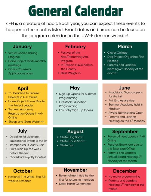 Also, check out our General 4-H Calendar for Trempealeau County. This is a rough calendar outline of what you can expect to see during the Trempealeau County 4-H year. The calendar includes some recurring deadlines and dates, as well as general month timelines for other events or activities, so you can have an idea of what to expect in the program and what to plan for. The calendar is linked to our website, so you can find out more information about the topic you are curious about!